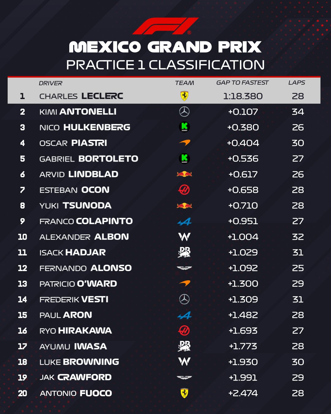 O piloto da Ferrari completou uma volta ao Autódromo Hermanos Rodríguez em 1:18.380, fechando a sessão com cerca de um décimo de segundo de vantagem sobre o Mercedes de Andrea Kimi Antonelli.