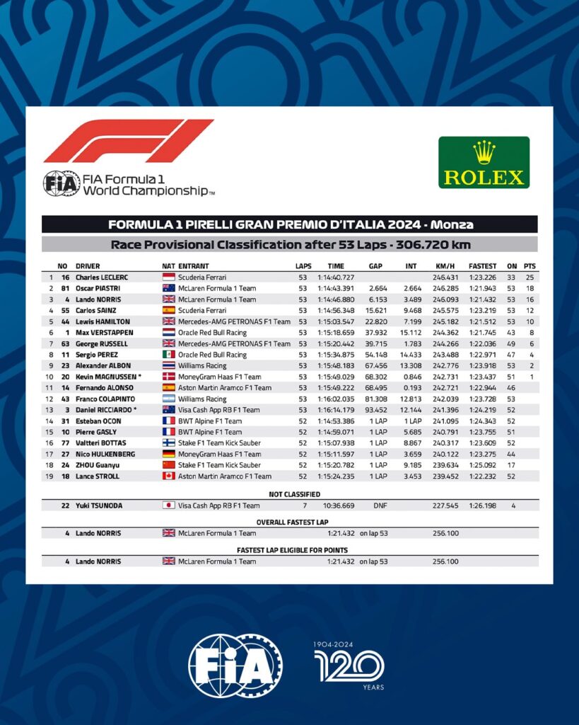 Apesar de terem conseguido superar o SF-24 de Carlos Sainz, os pilotos da McLaren não foram capazes de anular a diferença para Leclerc, que cruzou a linha de meta em dificuldades com os seus pneus, mas cerca de três segundos à frente de Piastri.