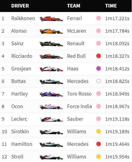 Na Williams, Robert Kubica abdicou de rodar no último dia e cedeu o volante do FW41 a Sergey Sirotkin e Lance Stroll, com o russo a ser 10º e o canadiano 12º.