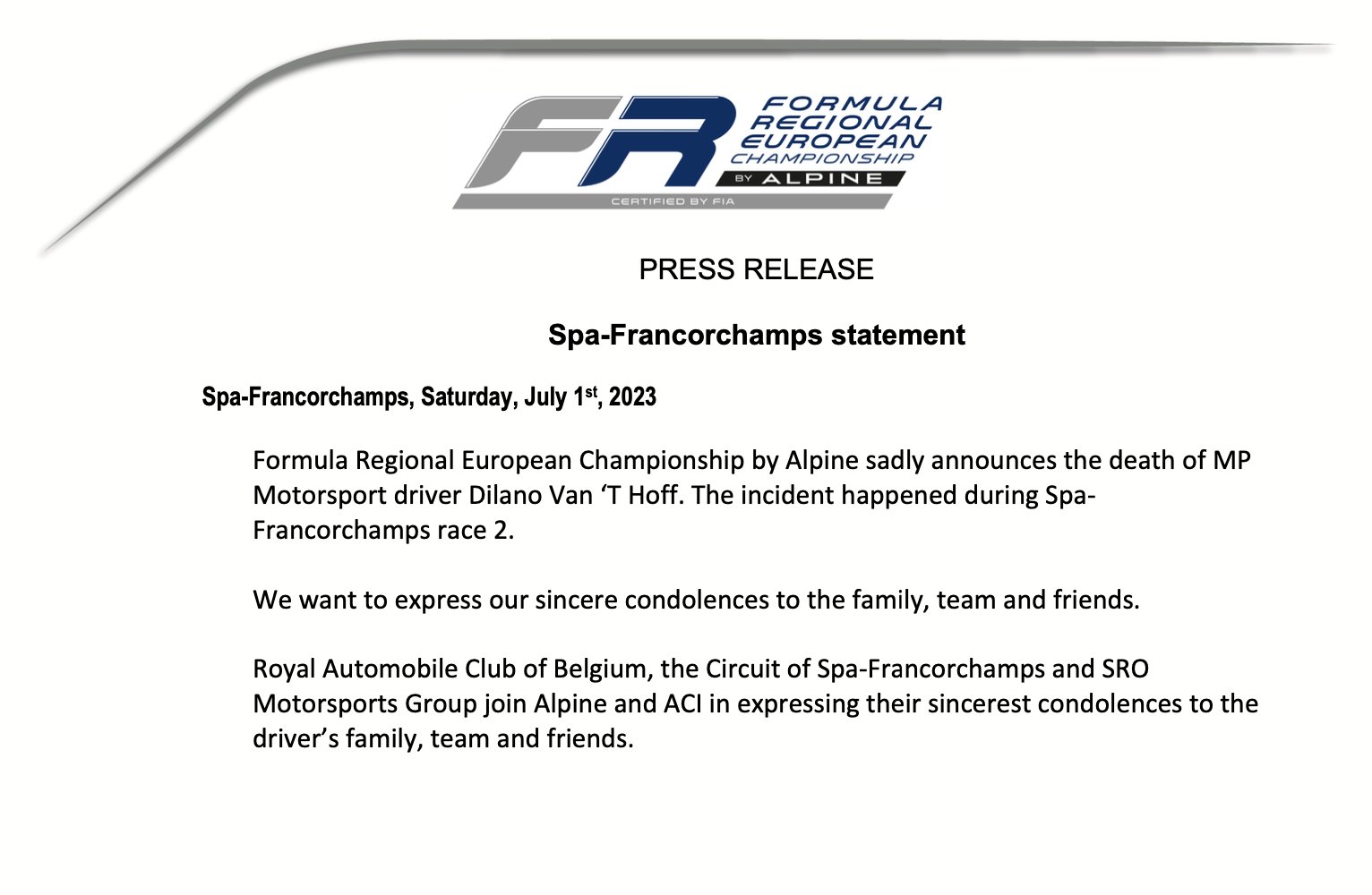 O neerlandês Dilano Van’t Hoff perdeu a vida na sequência de um acidente na segunda corrida da competição Formula Regional European Championship by Alpine em Spa-Francorchamps.