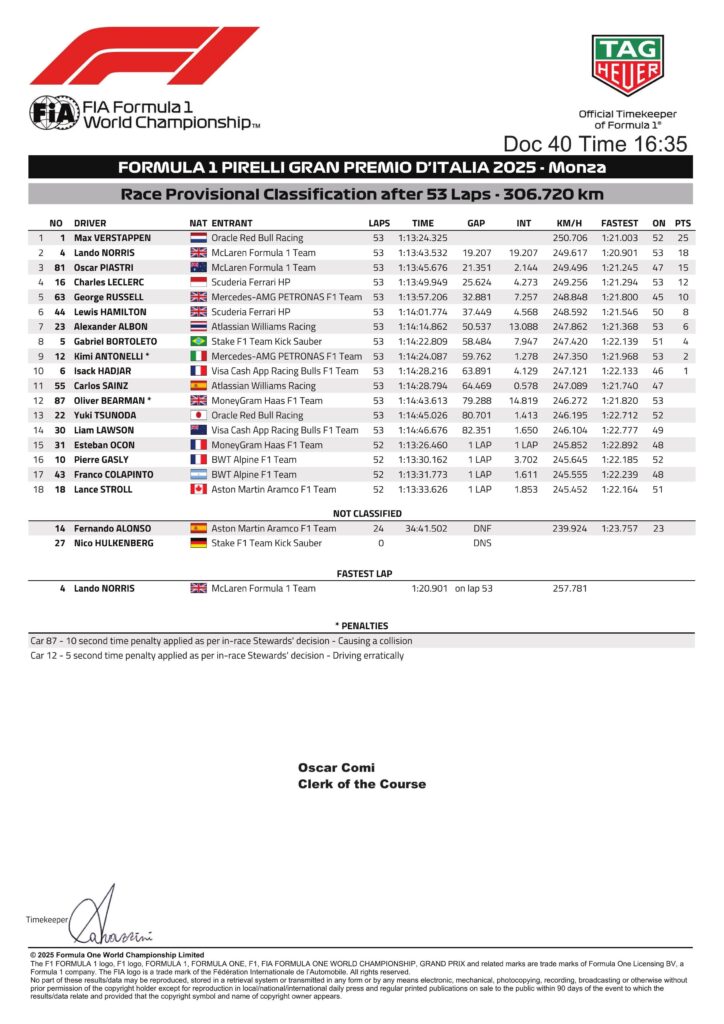 A encerrar os lugares pontuáveis ficaram o Mercedes de Andrea Kimi Antonelli e o Racing Bulls de Isack Hadjar, que arrancou da via das boxes em Monza.