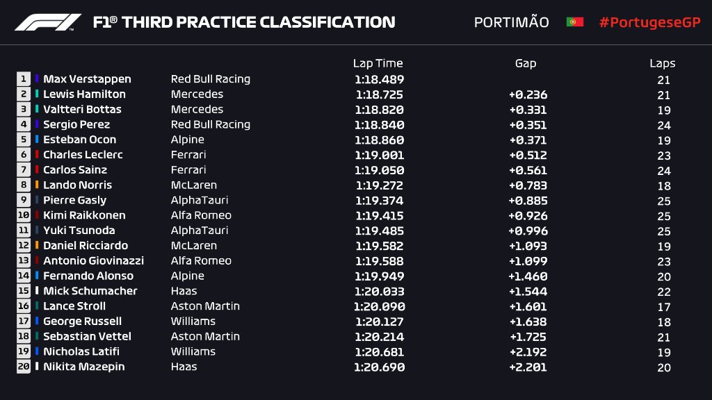 Max Verstappen foi o mais rápido no terceiro e último treino livre antes da sessão de qualificação em Portimão ao bater os dois Mercedes de Lewis Hamilton e Valtteri Bottas.